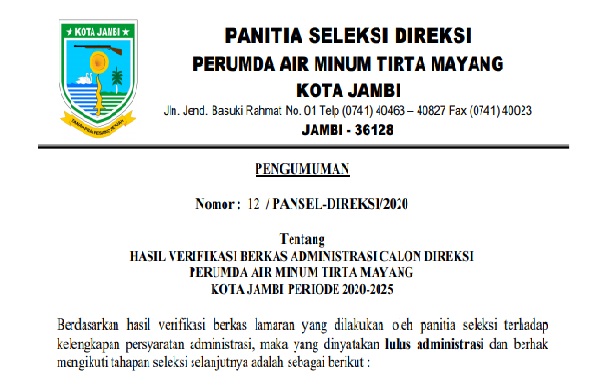 Penerimaan calon Direksi Perusahaan Daerah (Perumda) Air Minum Tirta Mayang Kota Jambi periode 2020-2025 telah memasuki tahapan seleksi. Pada fase awa...